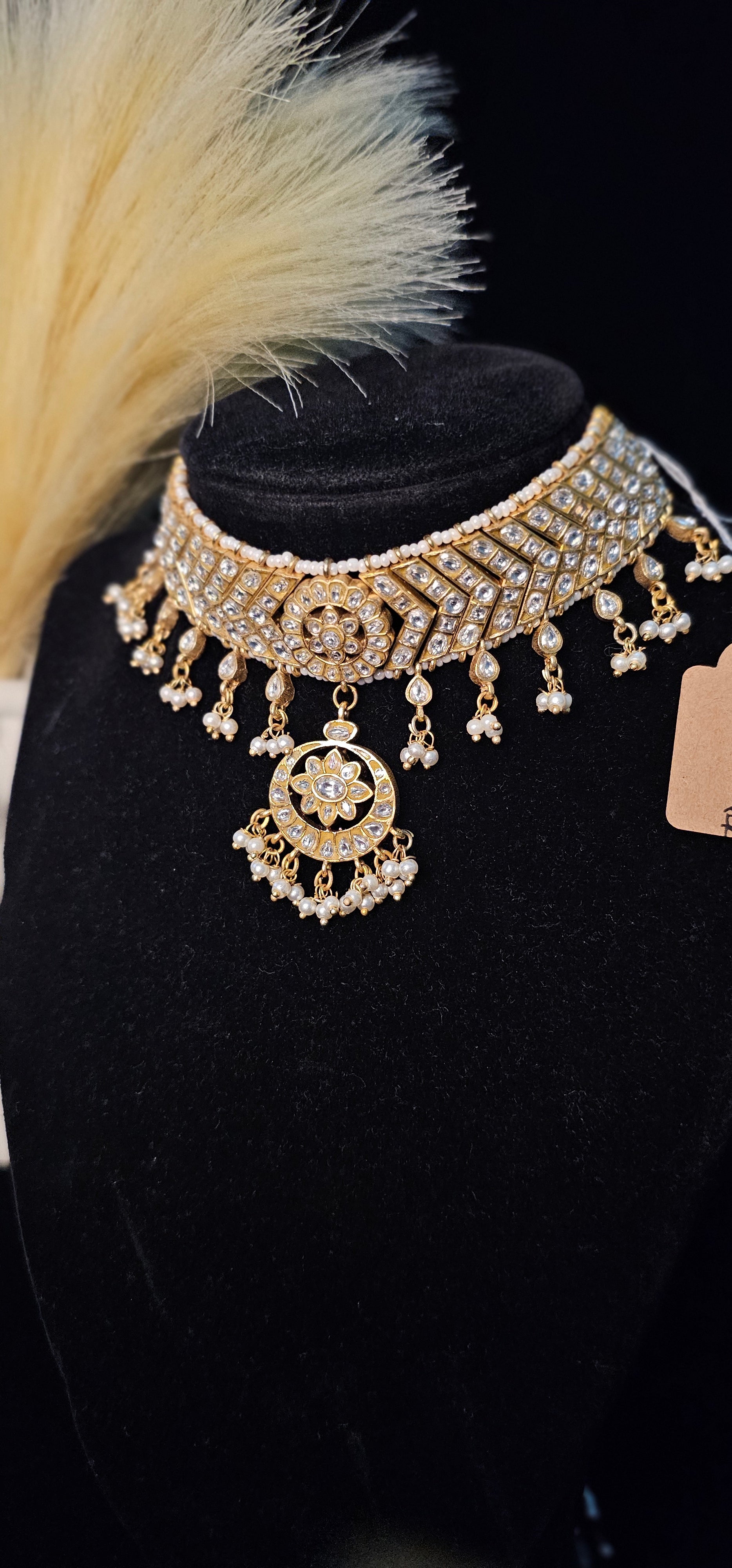 Exquisite Jadau Kundan Choker Handcrafted with radiant white kundan stones and delicate pearl-like drops, this choker exudes timeless beauty rooted in royal Indian artistry. A luxurious yet lightweight piece that complements all age groups from graceful young ones to elegant elders. Made with high-quality brass for lasting brilliance, it's a perfect choice for weddings, festive wear, or a regal style statement.
